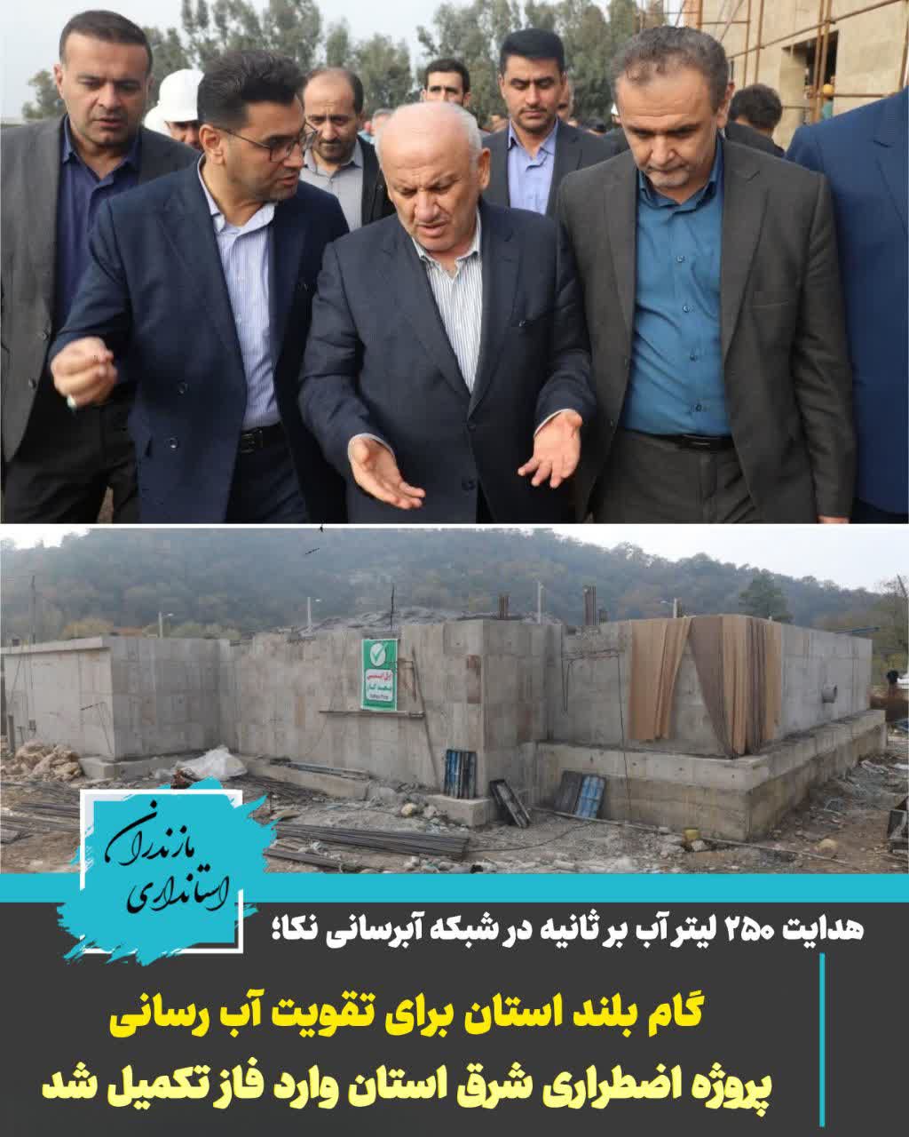 استاندار مازندران در جریان بازدید میدانی از پروژه اضطراری تأمین آب شرق استان، این طرح را یکی از مهمترین اقدامات برای حل مشکل کمآبی در شهرستانهای نکا و بهشهر دانست و تأکید نمود اجرای آن میتواند «کمک بسیار مؤثری» برای منطقه باشد