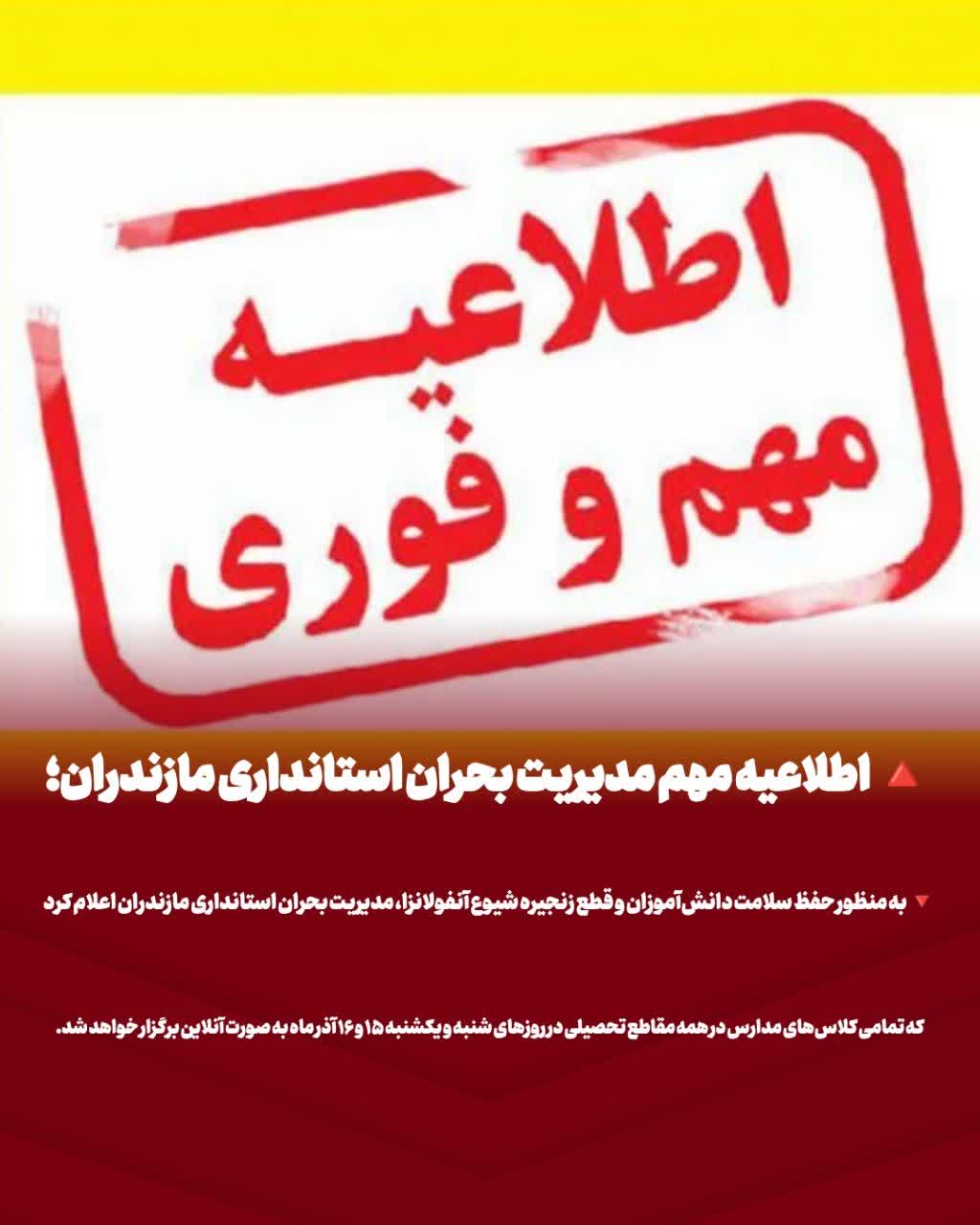 به منظور حفظ سلامت دانشآموزان و قطع زنجیره شیوع آنفولانزا، مدیریت بحران استانداری مازندران اعلام کرد: تمامی کلاسهای مدارس در همه مقاطع تحصیلی در روزهای شنبه و یکشنبه ۱۵ و ۱۶ آذر ماه به صورت آنلاین برگزار خواهد شد